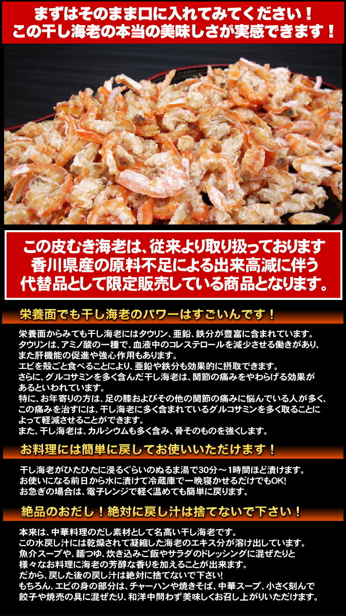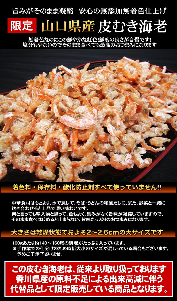 配送温度帯常温販売者株式会社さつま屋アレルギーえび商品説明この皮むき海老は、従来より取り扱っております「香川県産皮むき海老」の今期物完売に伴い、毎年6〜7月頃の新物入荷までの期間限定で代替品として販売を行っている「山口県産」の干しむき海老です。