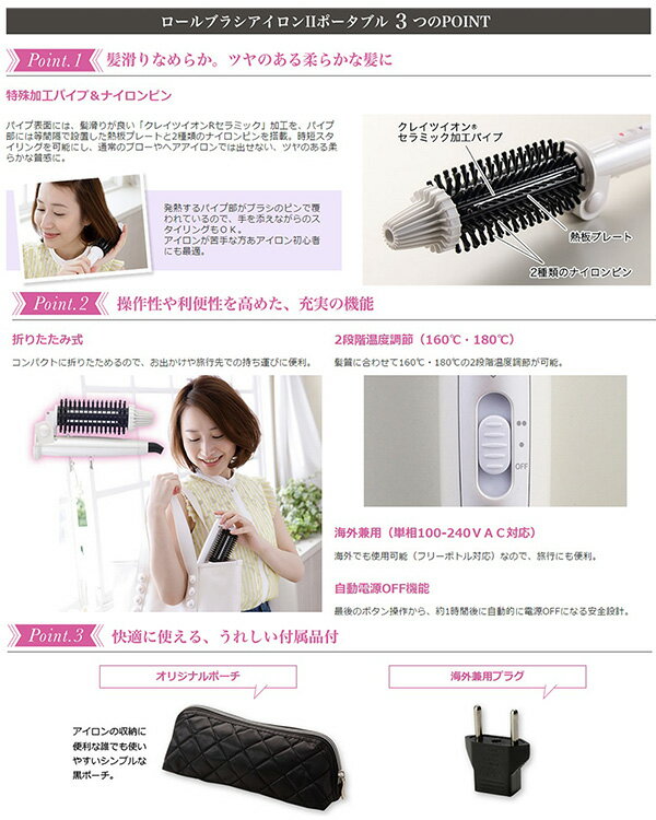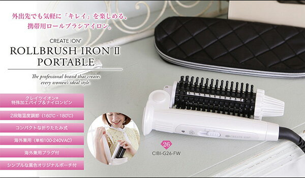 サイズ本体サイズ:約L280×H55×W45mm、本体重量:約305g(コード込)、パイプ直径:26mm仕様消費電力:190W-220W、電源/単相100-240VAC、コードの長さ/約2.0m、パイプ表面温度/約160℃・180℃(2段階温度調節)、加工仕上/パイプ部クレイツイオン セラミック加工、折りたたみ式、特殊加工パイプ&ナイロンピン、海外兼用(単相100-240VAC対応)、自動電源OFF機能付属品オリジナルポーチ、海外兼用プラグ、取扱い説明書、保証書保証期間1年間クレイツイオン ロールブラシアイロンII ポータブル アイロン 26mm CIBI-G26-FWCREATE ION ROLLBRUSH IRON II SERIES ヘアアイロン 海外兼用 折りたたみ式 オリジナルポーチ付外出先でも気軽に「キレイ」を楽しめる、携帯用ロールブラシアイロン。